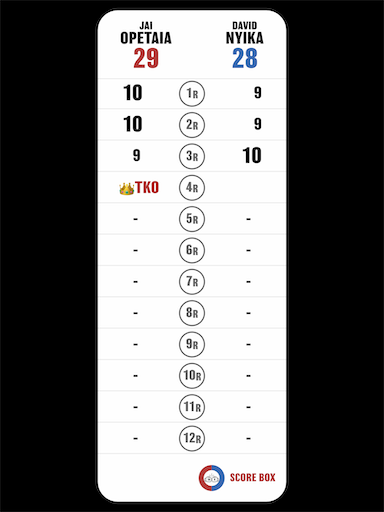 試合前、リング中央で闘志に満ちた眼で王者を睨みつける東京五輪銅メダリストのニカ。但しグローブタッチでうなずく表情には相手への敬意がうかがえる。試合が始まると闘志そのままに攻勢をかける挑戦者。しかし硬さがあるのか動きはぎこちない。パンチの威力、スピード、正確性ともにオペタイアが上回る印象。それでも勇気を振り絞って闘うニカ。3Rには硬さもとれてロープに詰めた連打で見せ場も作る。しかし続く4R、接近戦からの左ストレート、右アッパーでオペタイアが最初のダウンを奪う。すぐさま立ち上がったところに追い討ちをかけ、ロープに半身を預けた格好のニカに左アッパーを浴びせて失神KO。しばらく経ってからやっと立ち上がったニカに会場から拍手。それに気づいて「あ、どうも」という風に頭を下げる。やっぱり"ナイスガイベイビー"。