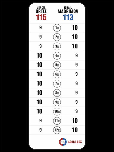 両手を下げたままリング上を動き回り、相手のわずかなスキを見逃さず有効打を決め、少ない手数で抜け目なくポイントを稼ぐ東欧スタイルの変則テクニシャンのマドリモフ。ガードを固めてプレスをかけ、強打を打ち込むメキシカンスタイルのバージル・オルティスJrには相性が良くないように見えた序盤だったが、中盤以降はプレスを強めて上下連打でポイントを連取。終盤、開き直ったマドリモフが足を止めての打ち合いで盛り返したものの追い上げ及ばす3-0でオルティスJrの勝利。WBC暫定スーパーウェルター級タイトルを防衛。