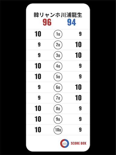 3Rに左ストレートをカウンターで二度当てて韓の腰を落とさせた川浦。それで余計な余裕を持ってしまったのか待ちのボクシングになってしまう。後手を踏んだ韓は挽回すべくひたすら前進しながら手数を繰り出す。終盤はスタミナ切れで手数がめっきり減った川浦を韓が圧倒しているように見えたが、判定はスプリットで川浦。前半の見栄えのいい左の印象が強かったのか。勝った川浦は現在WBOSフライ級2位だが、現状では世界は厳しい。